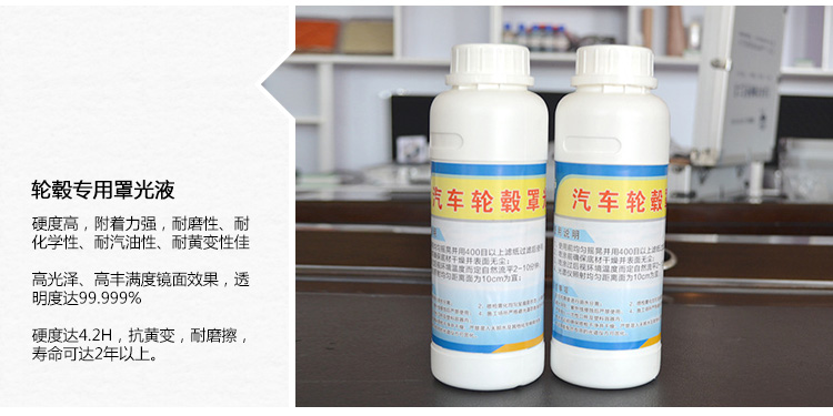 | LG-011 | 輪轂罩光液 | 采用輪轂專用罩光液,硬度高,附著力強(qiáng),耐磨性、耐化學(xué)性、耐汽油性、耐黃變性佳,高光澤、高豐滿度鏡面效果,透明度達(dá)99.999%。硬度達(dá)4.2H,抗黃變,耐磨擦,壽命可達(dá)2年以上。 | 2(瓶) | ![]() |