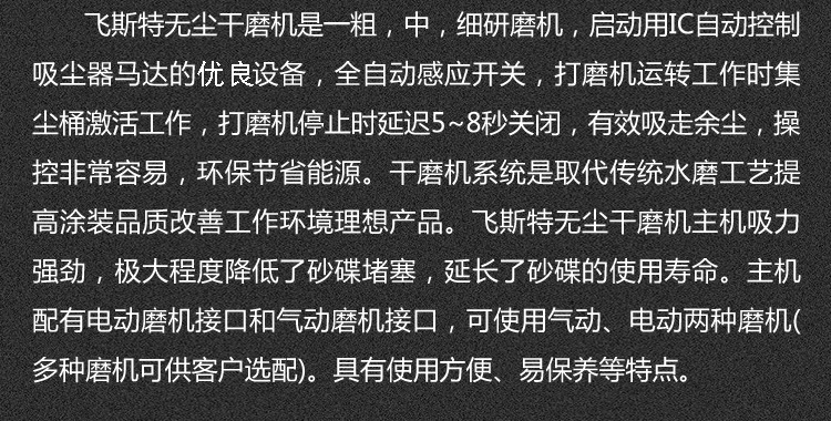飛斯特無塵干磨機是一粗,中,細研磨機,啟動用IC自動控制吸塵器馬達的先進設備,全自動感應開關,打磨機運轉工作時集塵桶激活工作,打磨機停止時延遲5~8秒關閉,有效吸走余塵,操控非常容易,環保節省能源。干磨機系統是取代傳統水磨工藝,提高涂裝品質改善工作環境理想產品。飛斯特無塵干磨機主機吸力強勁,極大程度降低了砂碟堵塞,延長了砂碟的使用壽命。主機配有電動磨機接口和氣動磨機接口,可使用氣動、電動兩種磨機(多種磨機可供客戶選配)。具有使用方便、易保養等特點。